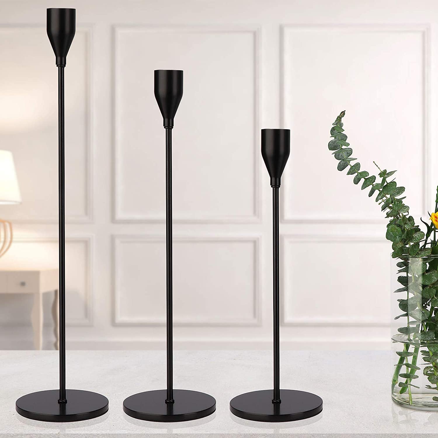 • 🌺Black candlesticks🌺 — Size.It comes in different height with exclusive matte black gives you a simple and timeless looking . S:3.15inch×9.45inch×0.9inch, M:3.15inch×11.42inch×0.9inch, L:3.15inch×13.28inch×0.9inch. Suitable for 7/8 in/2.2 cm candles and led taper candles. The base diameter is 3.15 in / 8 cm.Candles not included.